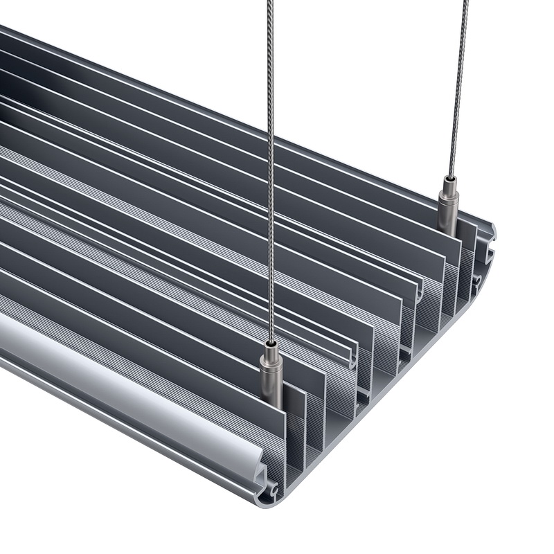 Корпус светильника изготовлен из анодированного алюминия, не подвержен коррозии. Легкое крепление с помощью рым-болтов, возможна замена на тросовые подвесы.