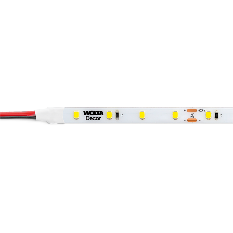 Декоративная светодиодная лента WOLTA®Decor cерии WLS представляет собой современный LED-модуль на гибкой печатной (монтажной) плате, на которой равноудалённо друг от друга расположены мощные светодиоды. Ширина ленты составляет 8-10 миллиметров (в зависимости от модели), а ее толщина со светодиодами 1-2 миллиметра. При изготовлении лента сматывается в катушку длиной 5 метров. Для ограничения подачи тока через наши светодиоды в электрическую схему WLS введены балластные сопротивления (резисторы), которые размещены на самой ленте.